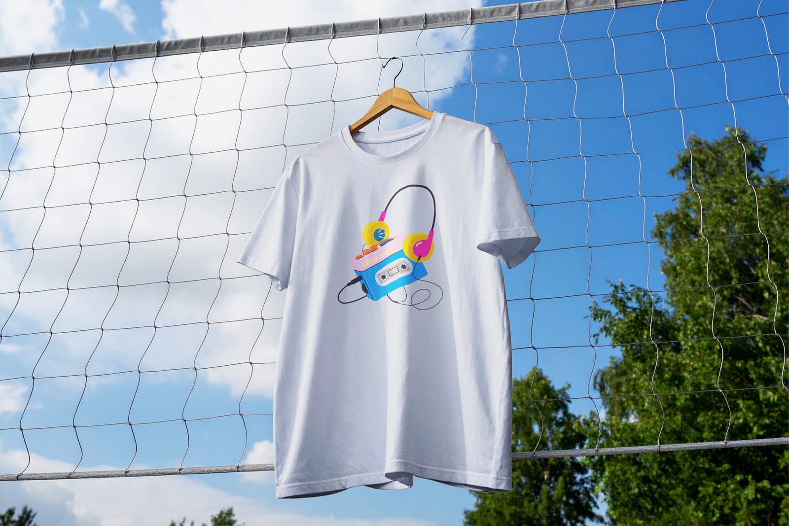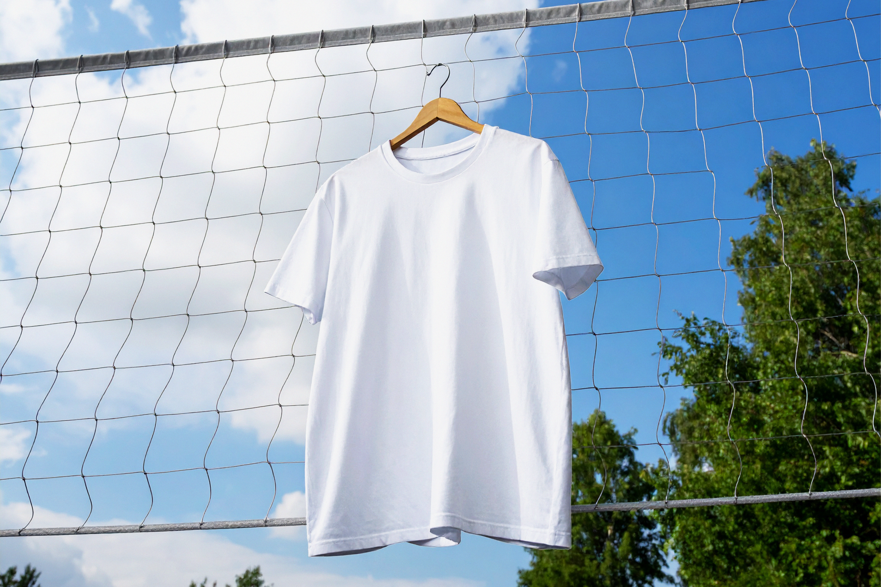 Outdoor Hanging White T-Shirt Mockup on Net Background